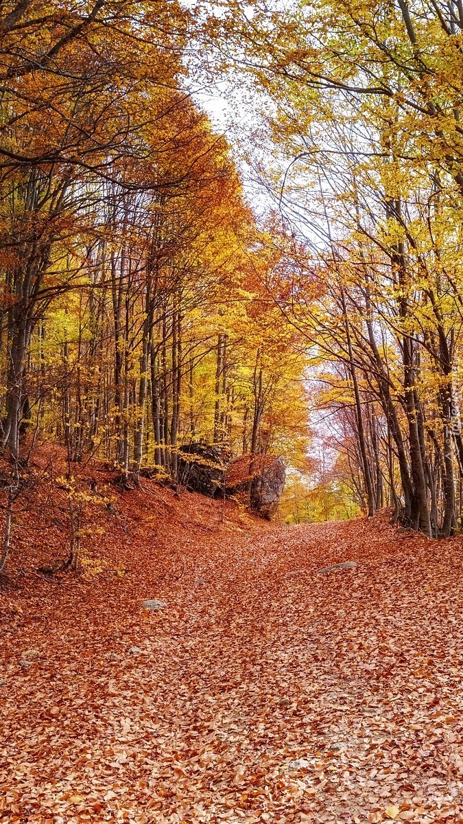 Edytor tapety: Droga w lesie pokryta opadłymi liśćmi