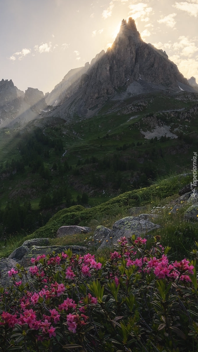 Edytor tapety: Różowe kwiaty na tle gór