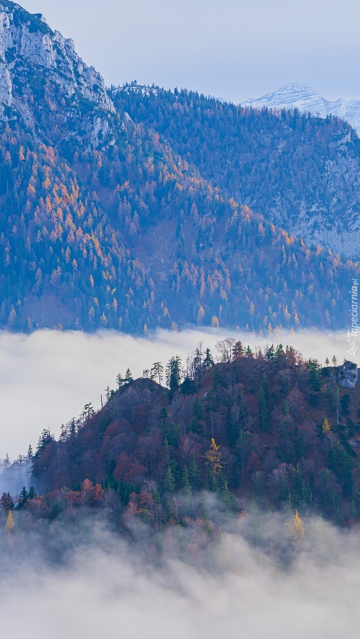 Edytor tapety: Gęsta mgła nad drzewami w górach
