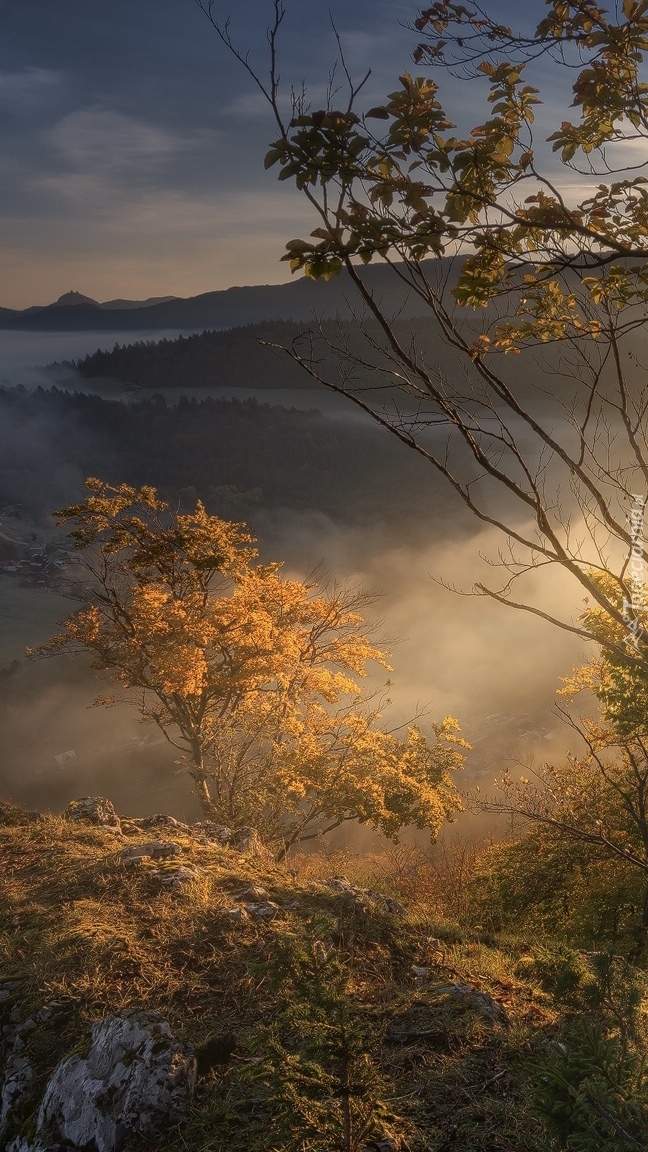 Edytor tapety: Rozświetlone jesienne drzewa na skałach