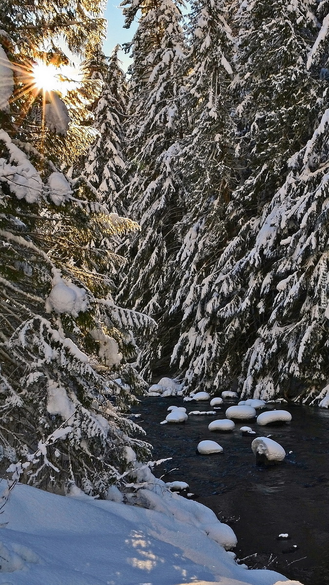 Edytor tapety: Ośnieżone drzewa nad rzeką