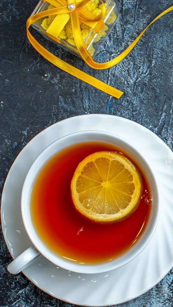 Edytor tapety: Filiżanka herbaty z cytryną obok prezentu