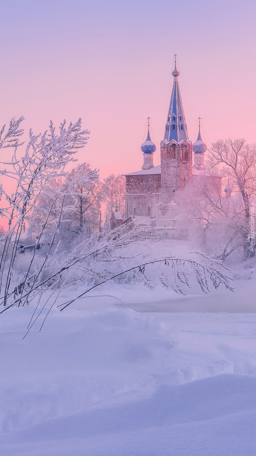 Edytor tapety: Ośnieżone drzewa i cerkiew w Dunilovie