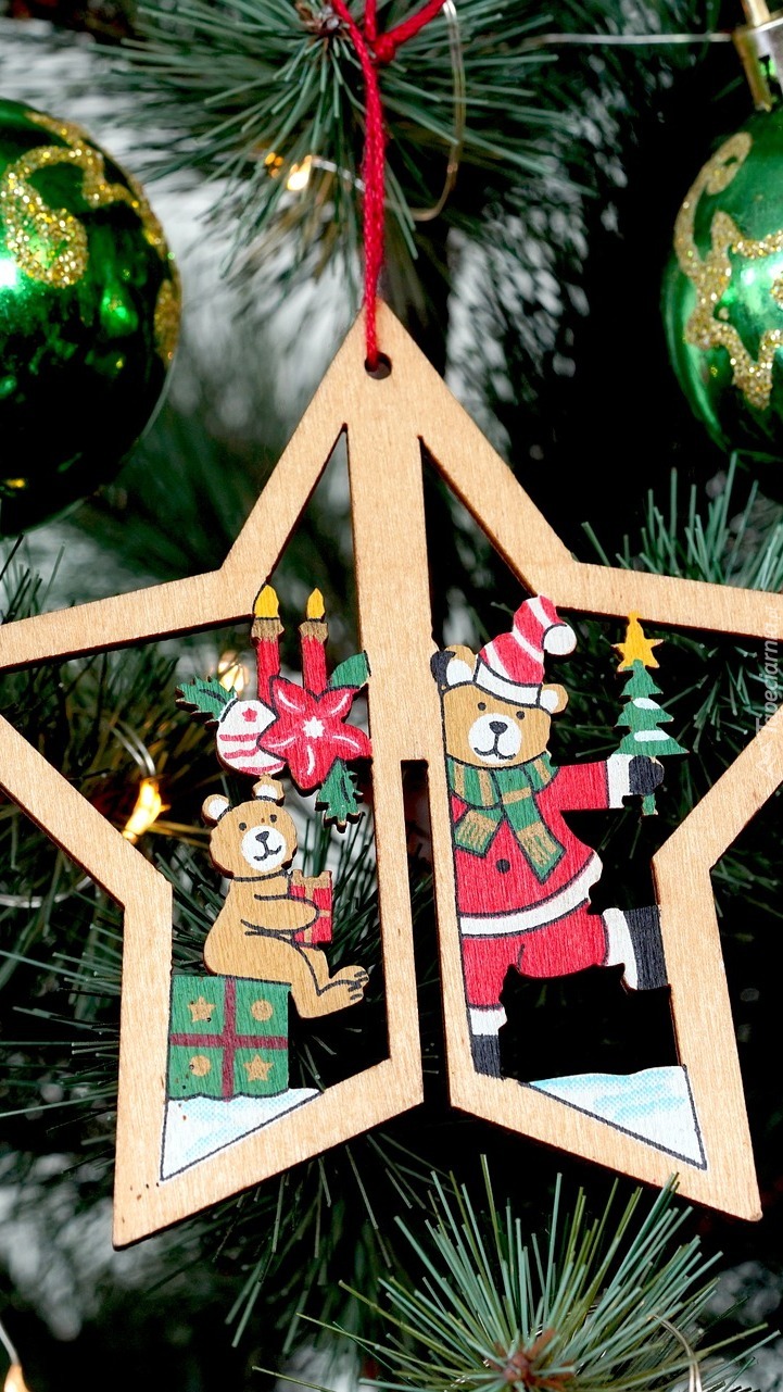 Edytor tapety: Drewniana gwiazda z misiami na choince