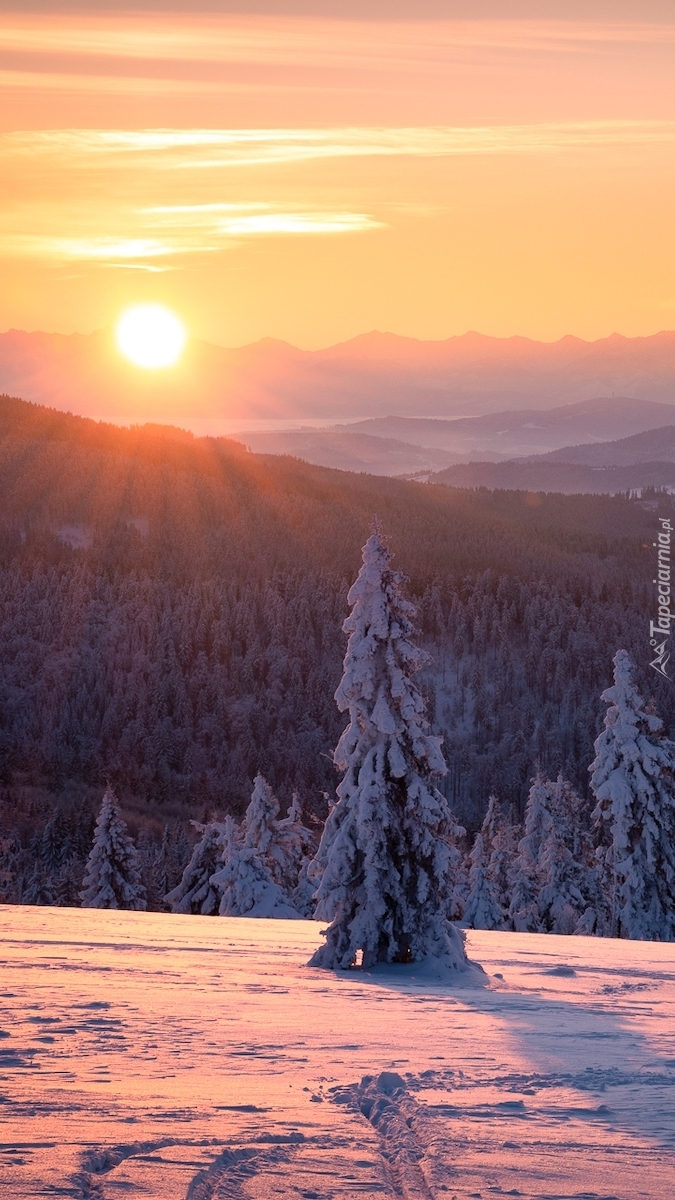 Edytor tapety: Świerki w śniegu o wschodzie słońca