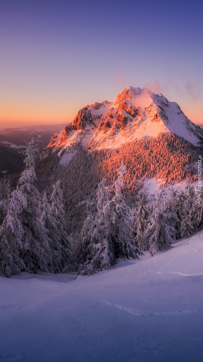 Edytor tapety: Ośnieżone drzewa pod rozświetloną słońcem górą