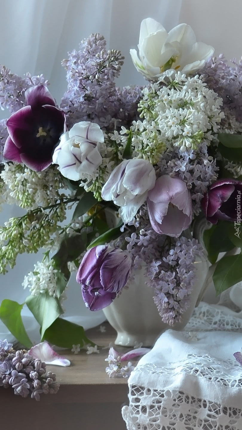 Edytor tapety: Bez i tulipany w wazonie