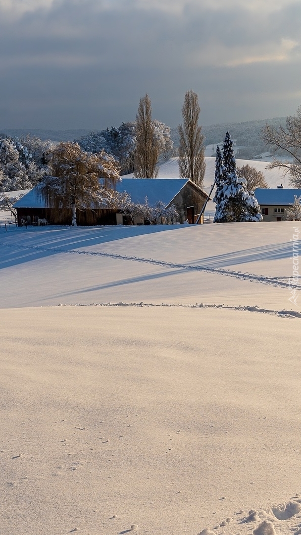 Edytor tapety: Dom i drzewa na zaśnieżonym wzgórzu