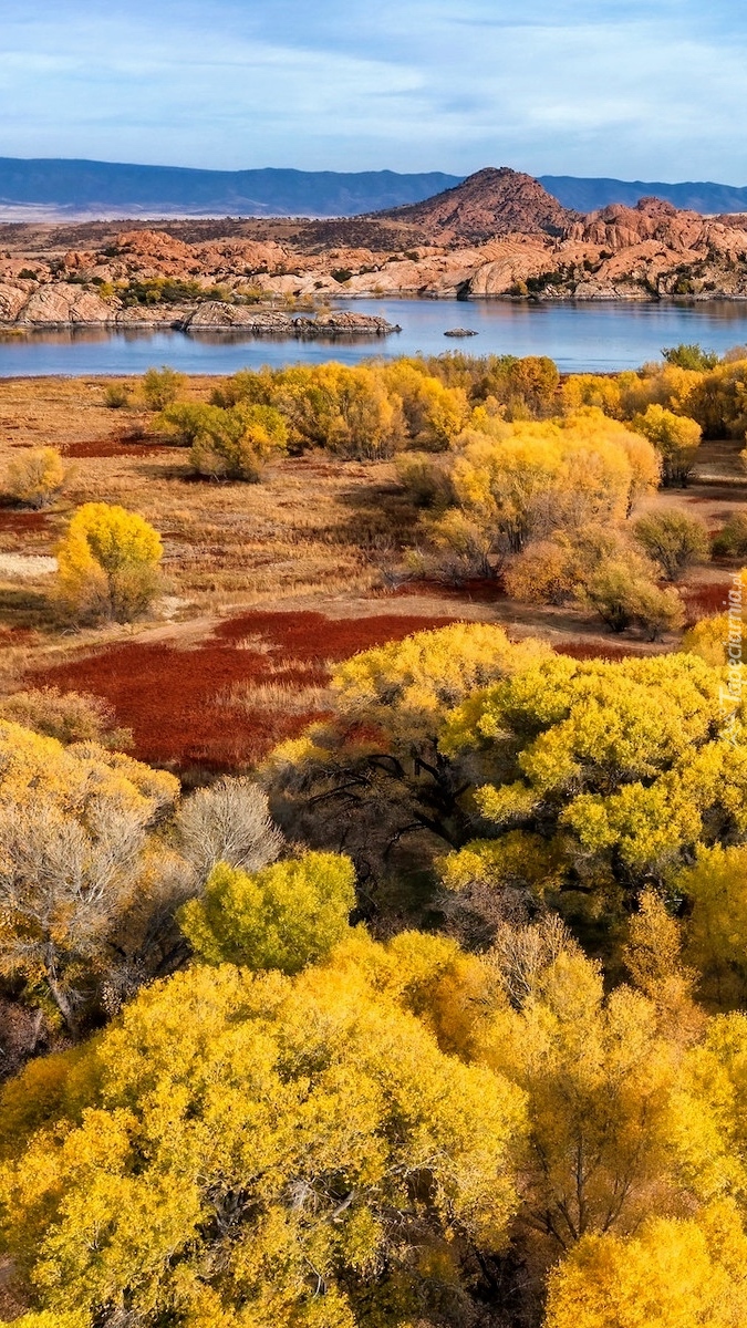 Edytor tapety: Jesienne drzewa i skały nad jeziorem