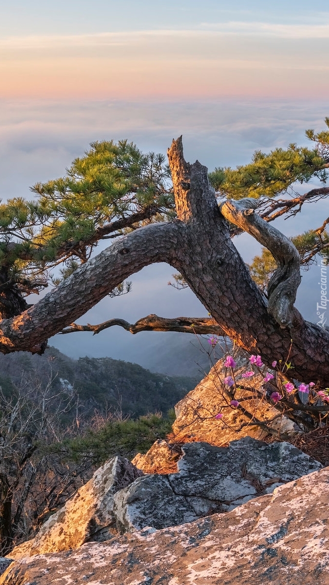 Edytor tapety: Pochylona sosna na skale