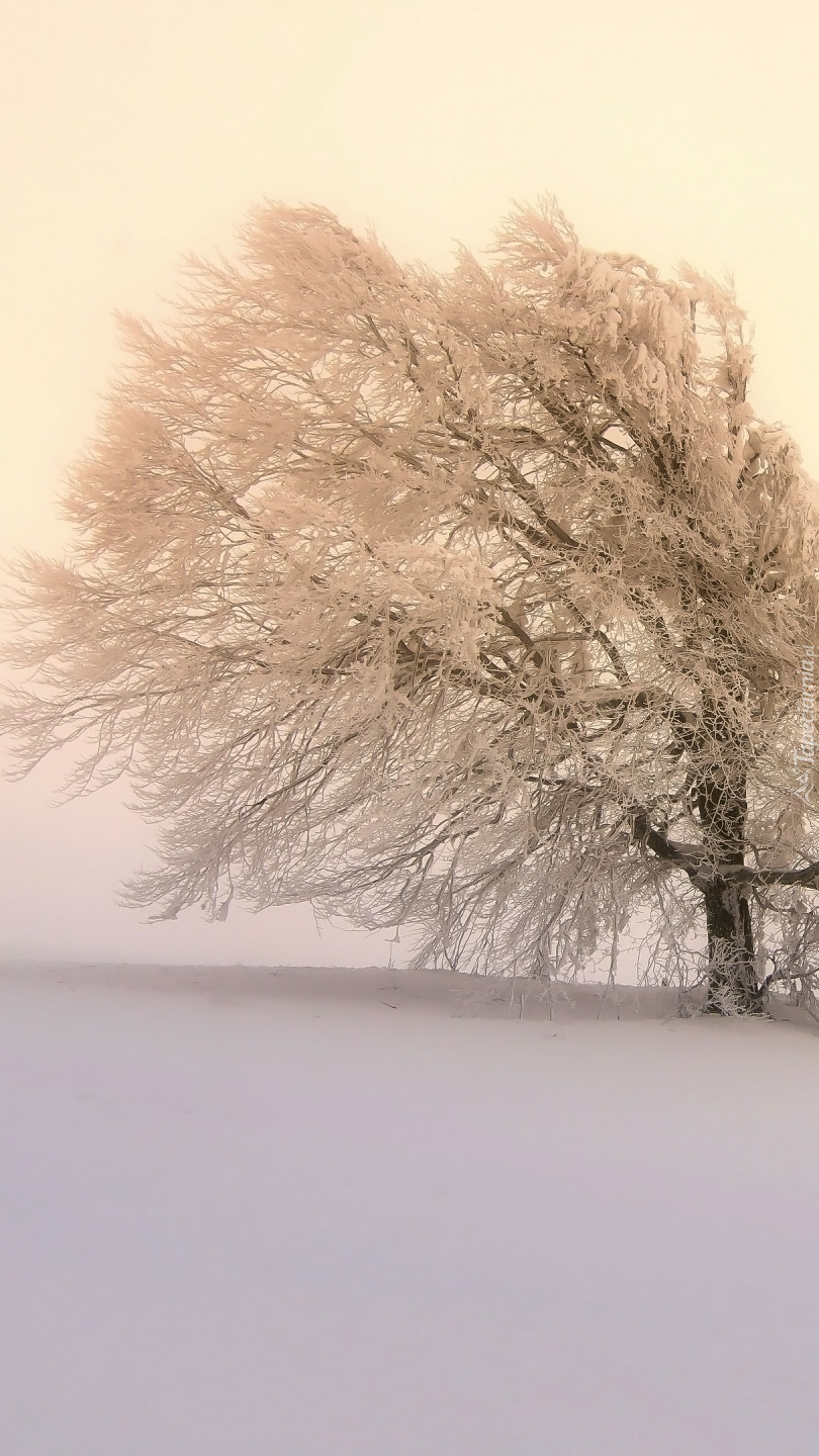 Edytor tapety: Oszronione drzewo w śniegu we mgle
