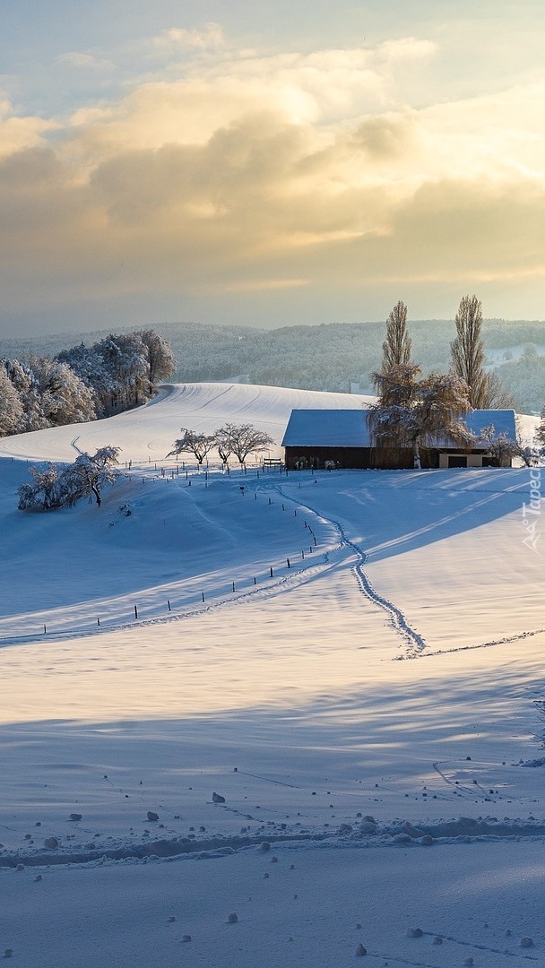 Edytor tapety: Dom na wzgórzu przysypany śniegiem