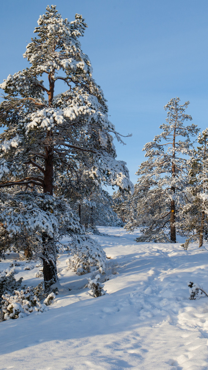 Edytor tapety: Ośnieżone drzewa pod błękitnym niebem