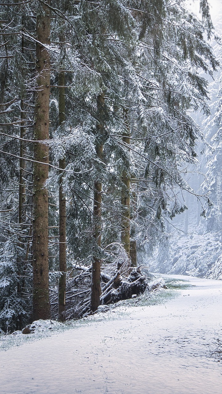Edytor tapety: Drzewa przy ośnieżonej drodze w lesie