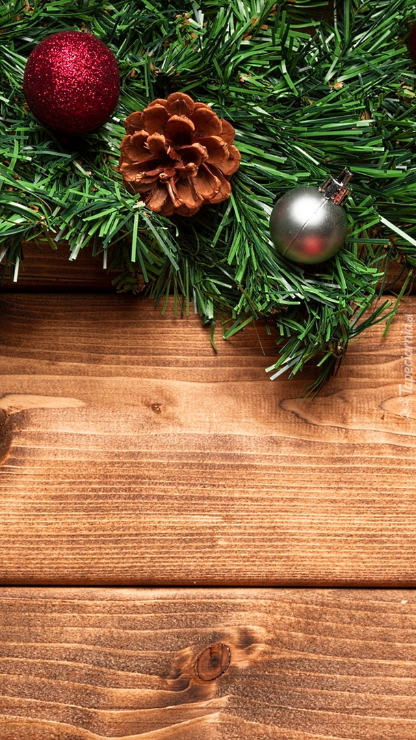 Edytor tapety: Zielone gałązki i bombki na deskach