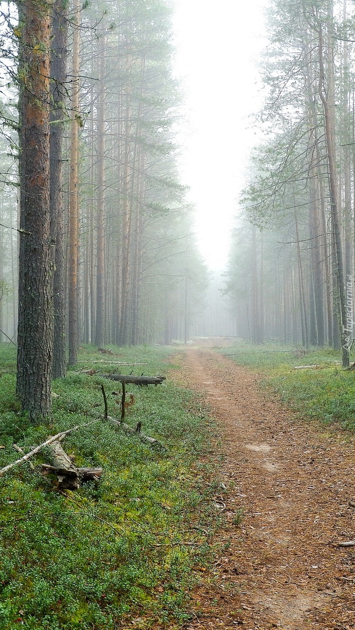 Edytor tapety: Wysokie drzewa w zamglonym lesie