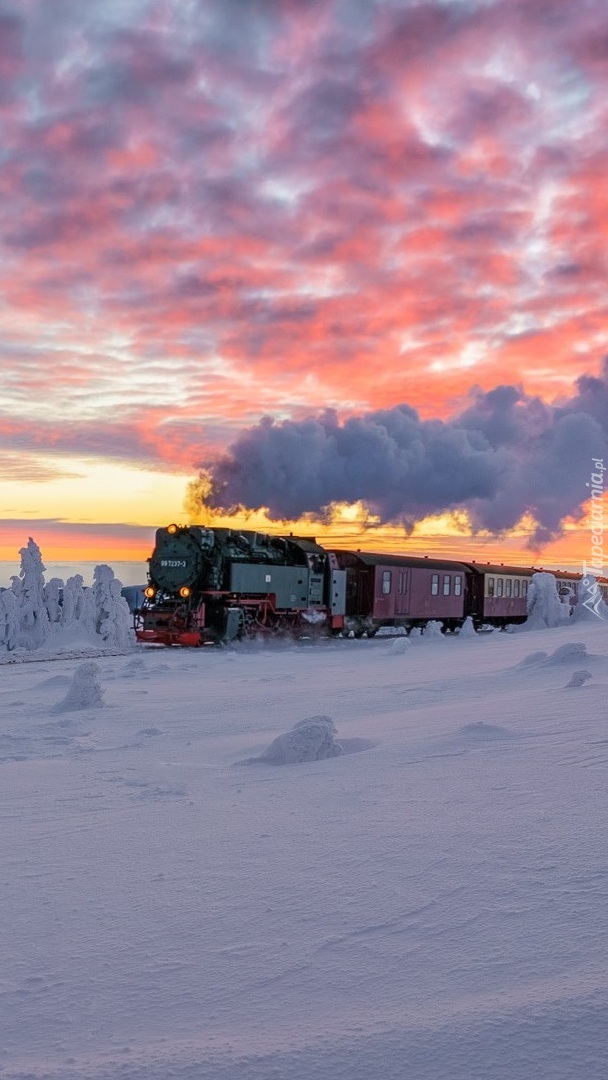 Edytor tapety: Pociąg parowy jadący obok zaśnieżonych drzew