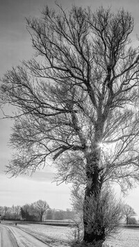 Edytor tapety: Promienie słońca w gałęziach oszronionego drzewa