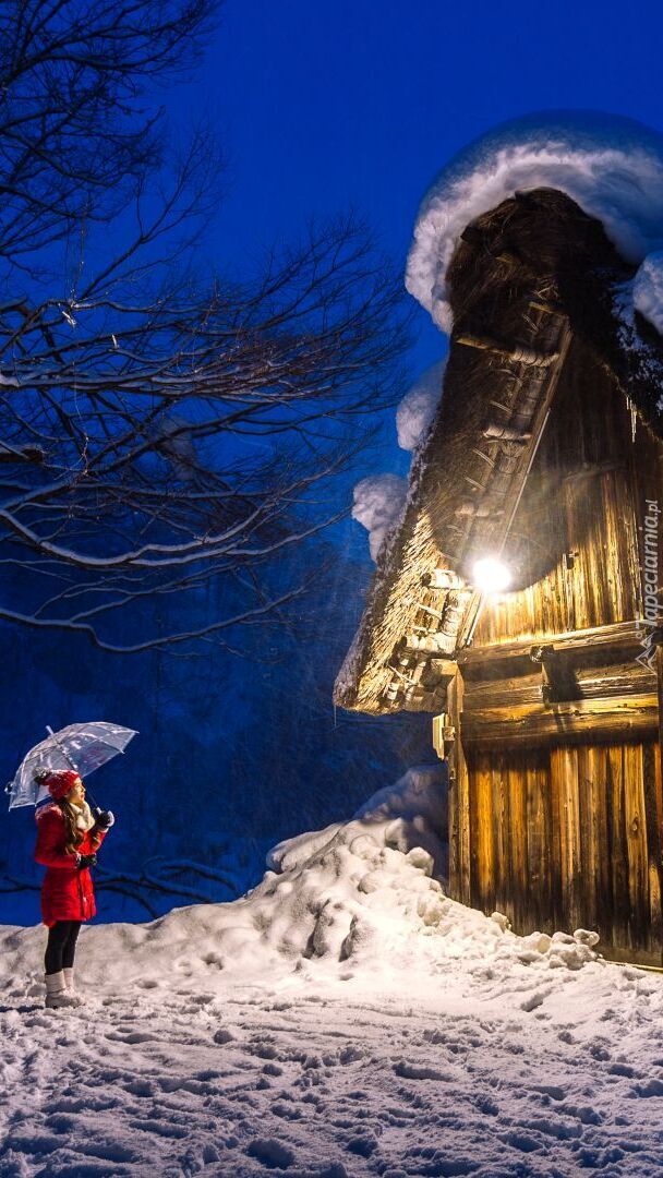Edytor tapety: Kobieta obok zasypanego śniegiem drewnianego domu
