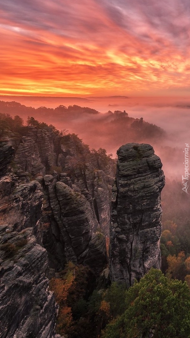 Edytor tapety: Zamglone Góry Połabskie pod kolorowym niebem