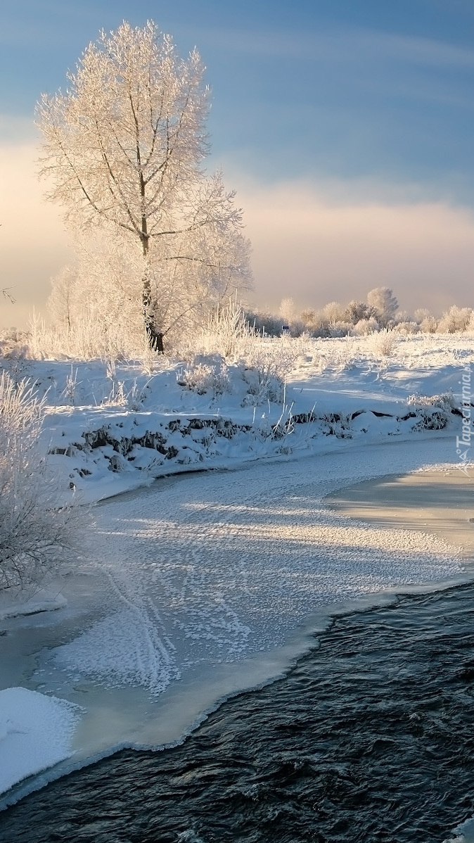 Edytor tapety: Rozświetlone oszronione drzewo nad rzeką