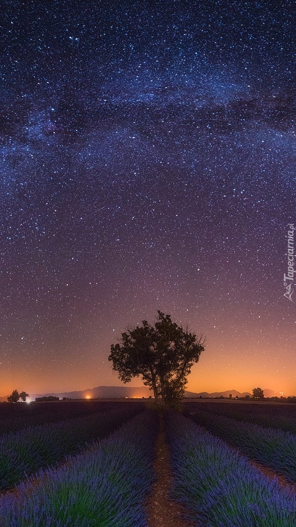 Edytor tapety: Rozgwieżdżone niebo nad polem lawendy