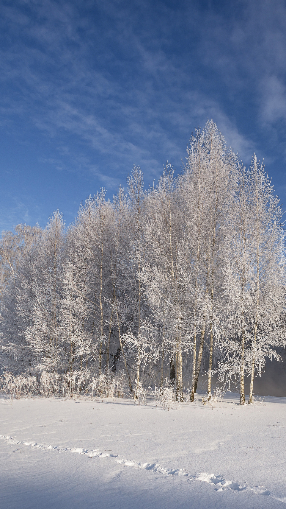 Edytor tapety: Ślady w śniegu i oszronione drzewa