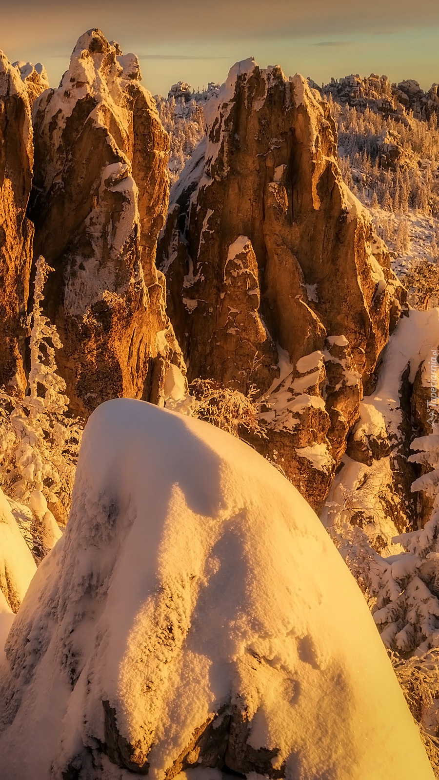 Edytor tapety: Rozświetlone słońcem ośnieżone skały i drzewa