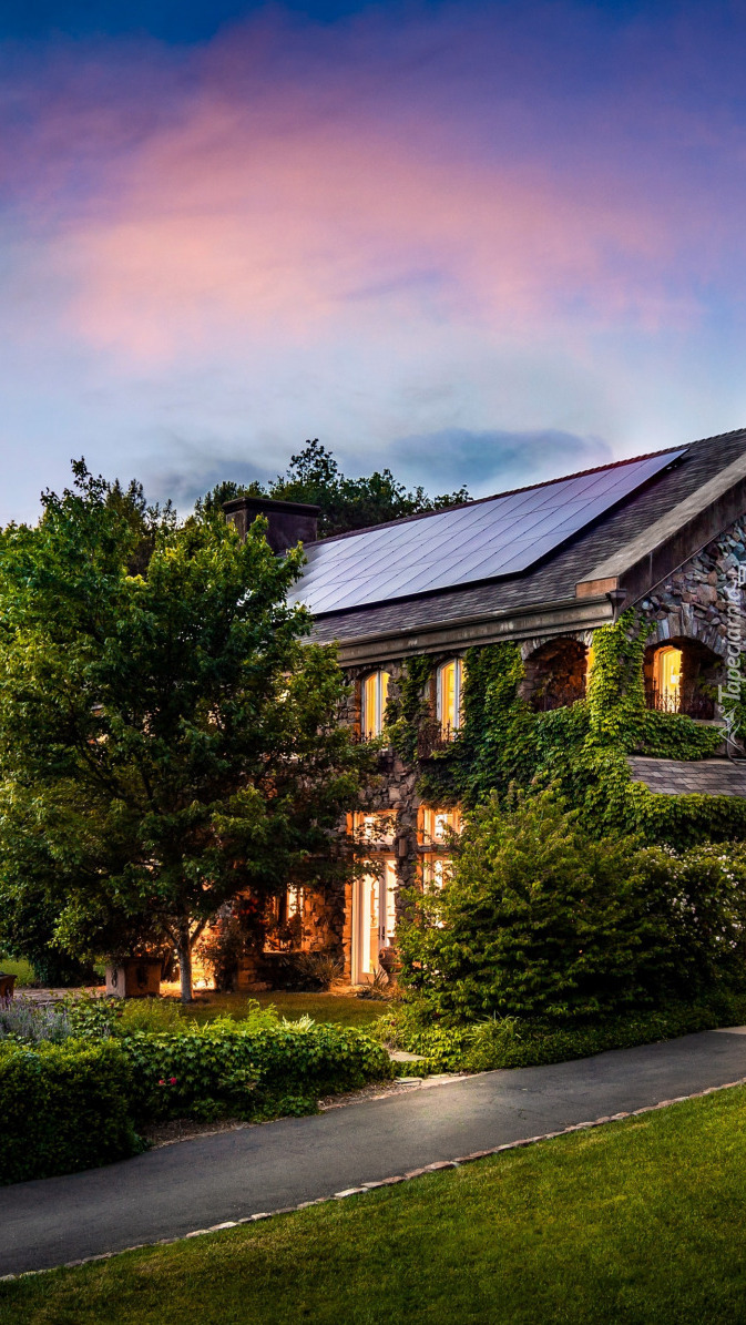 Edytor tapety: Oświetlony kamienny dom wśród drzew