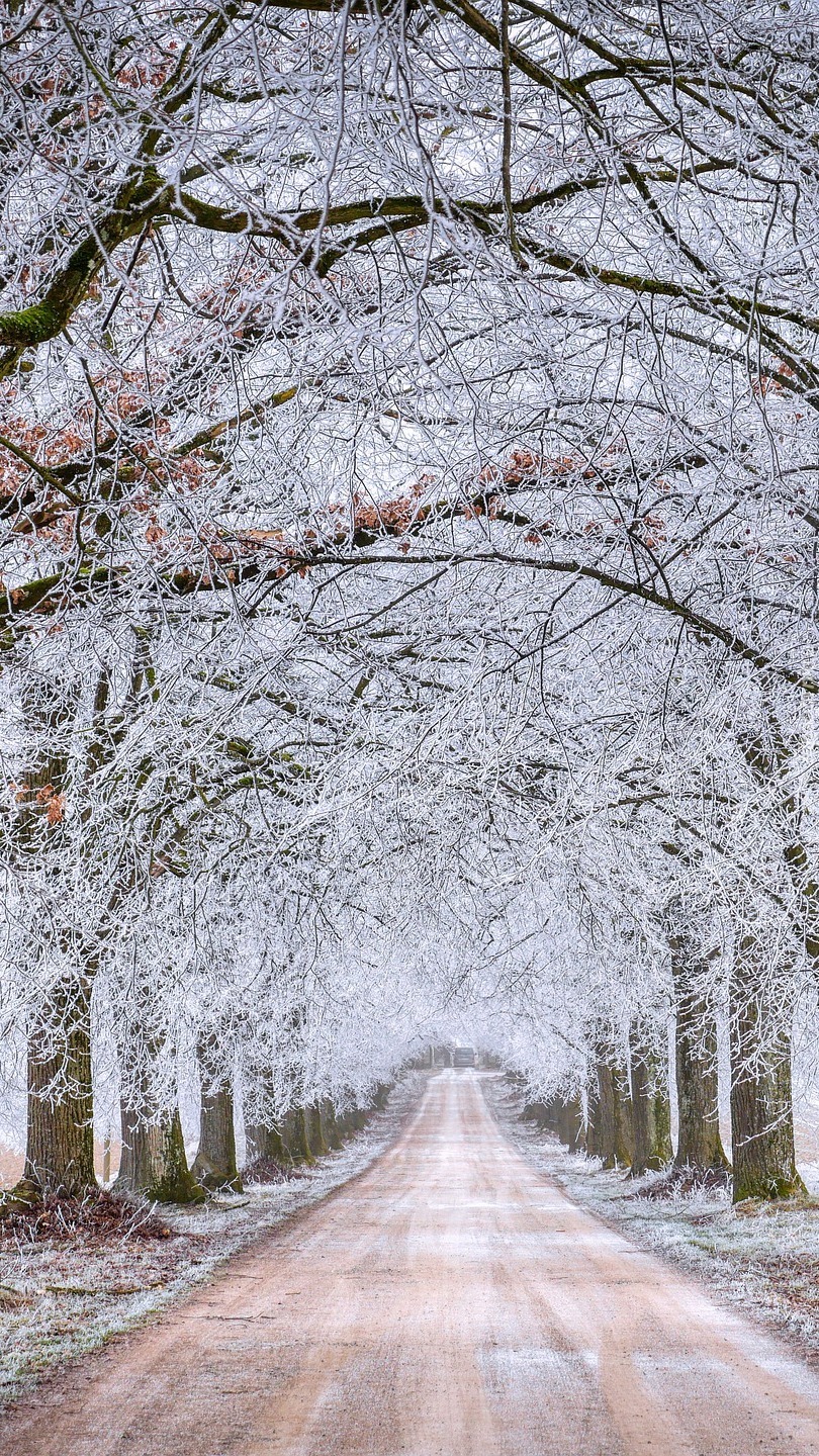 Edytor tapety: Oszronione drzewa na poboczu drogi