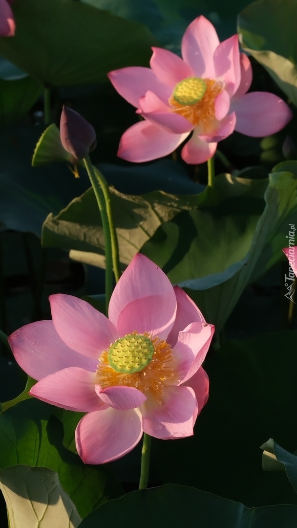 Edytor tapety: Rozwinięte różowe lotosy wśród liści
