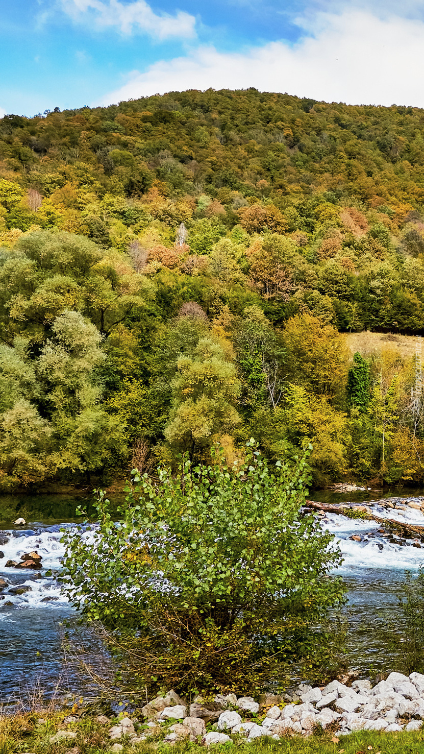 Edytor tapety: Zadrzewione wzgórza nad rzeką