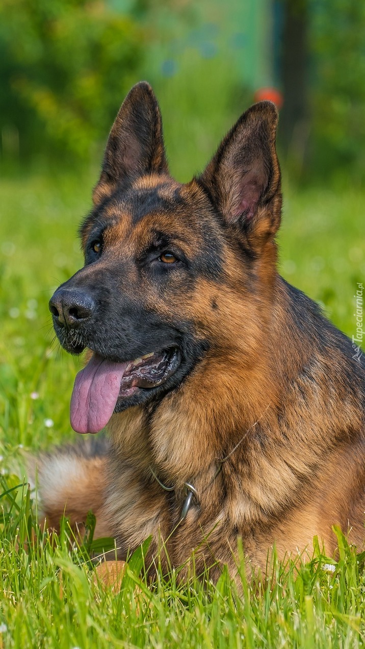Edytor tapety: Leżący na trawie owczarek niemiecki