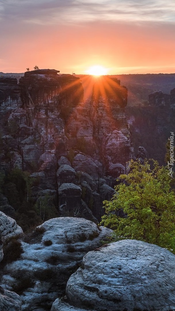 Edytor tapety: Promienie zachodzącego słońca nad Górami Połabskimi