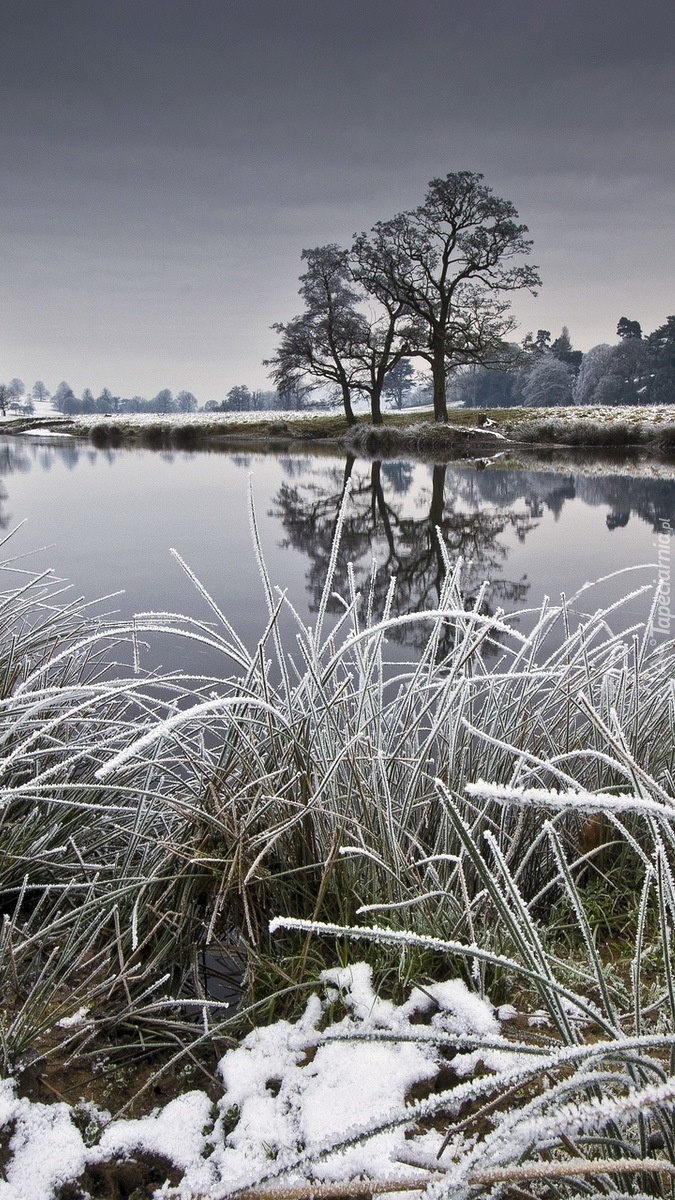 Edytor tapety: Zmroziło trawy nad jeziorem