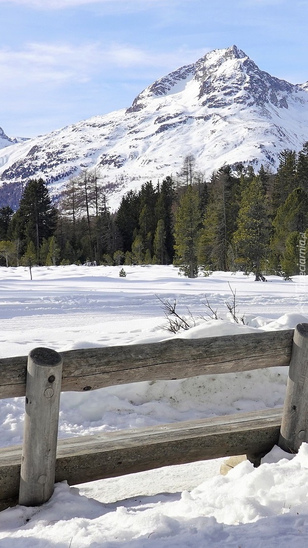 Edytor tapety: Zaśnieżona ławka na górskiej polanie