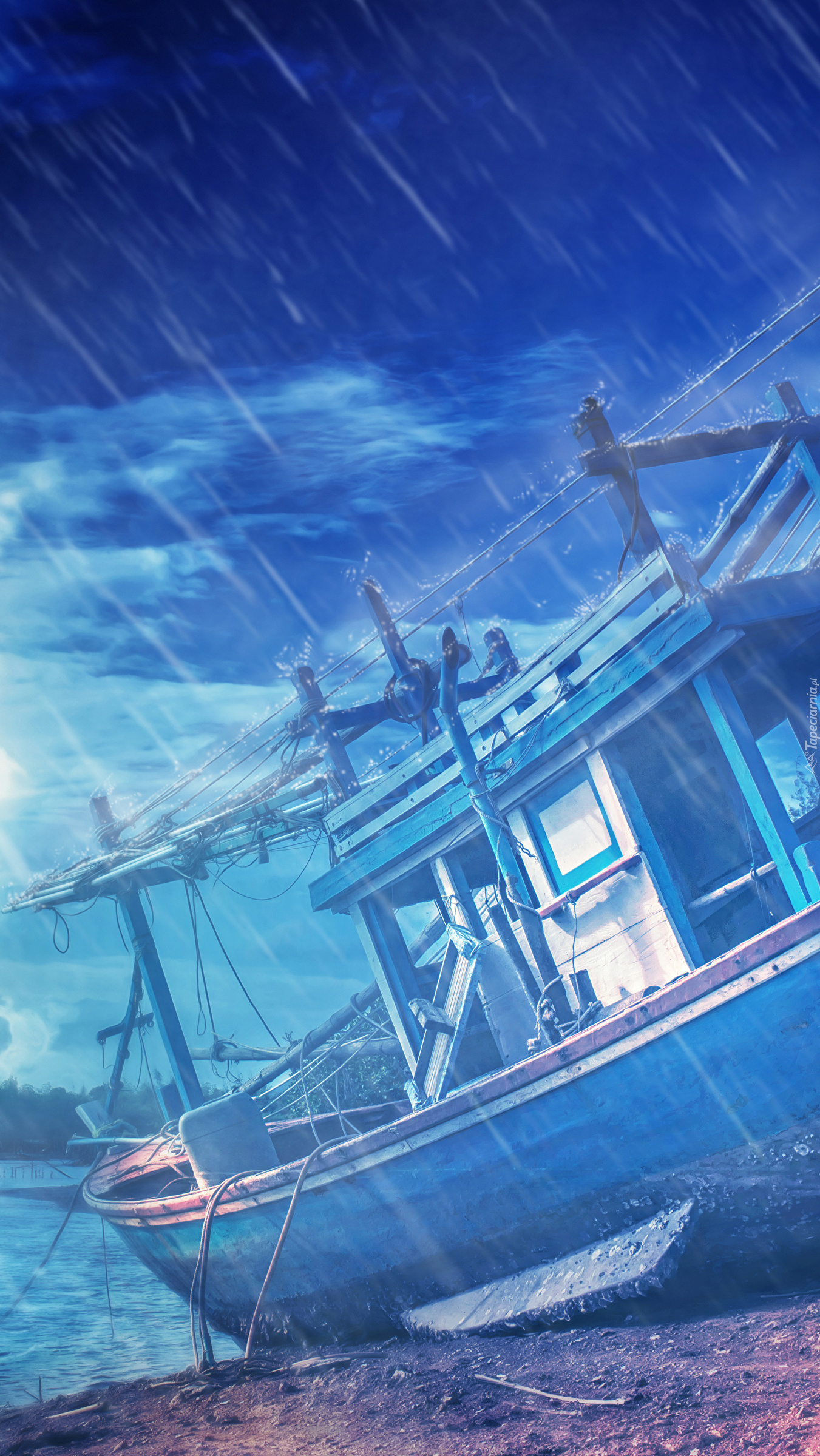 Edytor tapety: Łódka w deszczu na brzegu rzeki