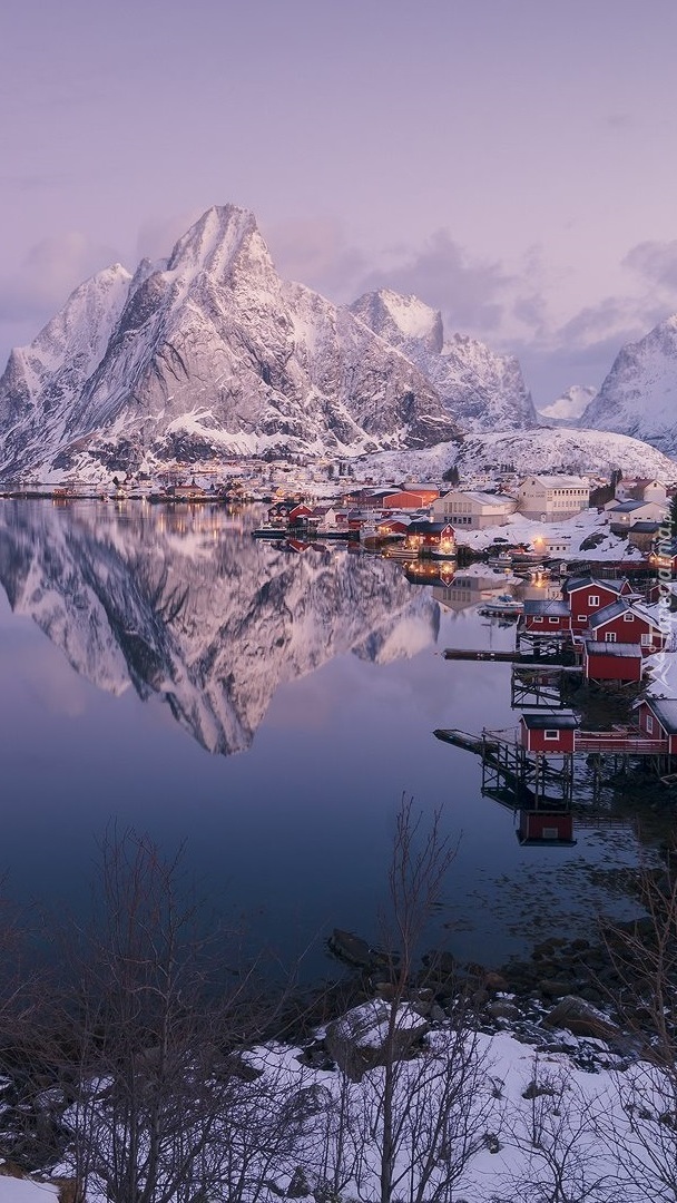 Edytor tapety: Wioska Reine i ośnieżone góry