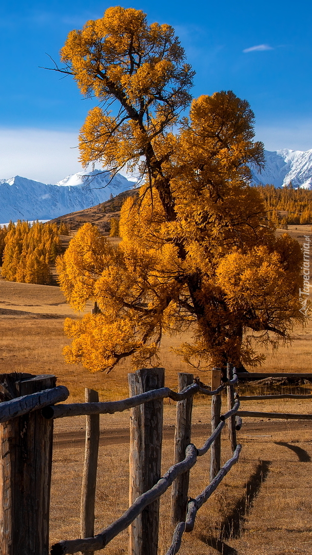 Edytor tapety: Pożółkłe drzewo i drewniany płot