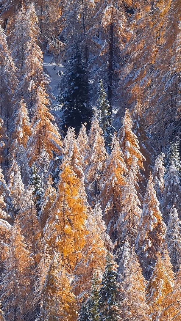 Edytor tapety: Rozświetlone ośnieżone pożółkłe drzewa