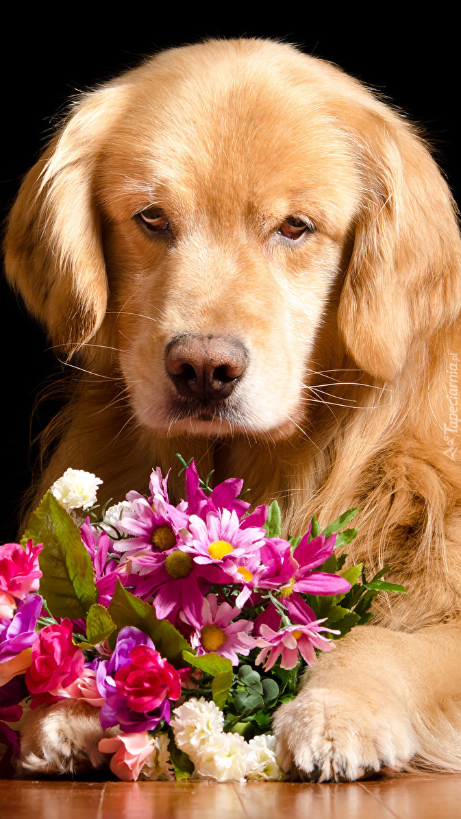 Edytor tapety: Golden retriever z bukietem kwiatów