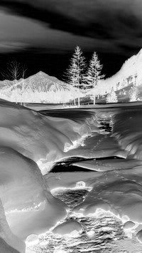 Edytor tapety: Ślady na śniegu przy rzece o zachodzie słońca