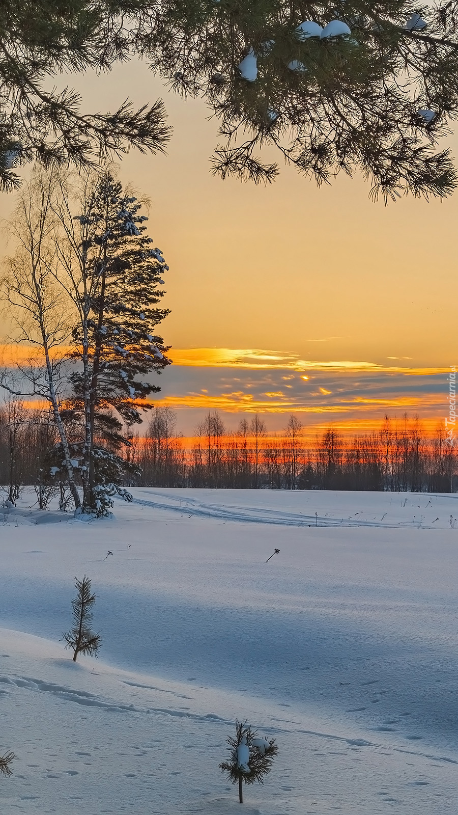 Edytor tapety: Zaśnieżona polana na tle zachodu słońca