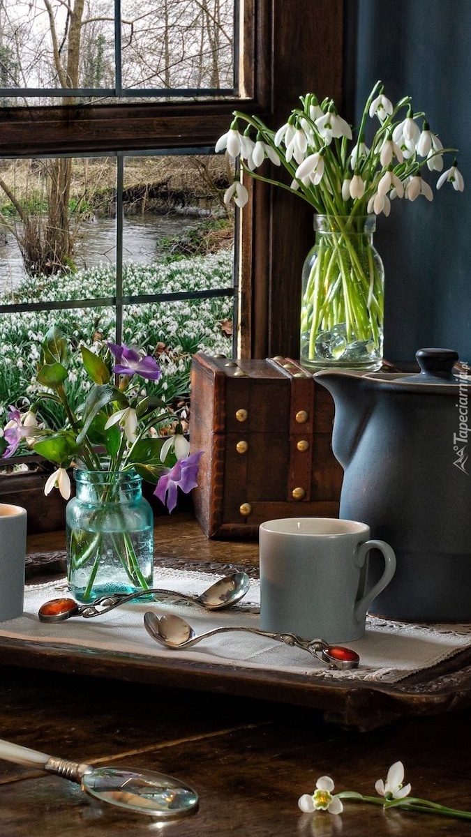 Edytor tapety: Bukiet przebiśniegów obok dzbanka przy oknie