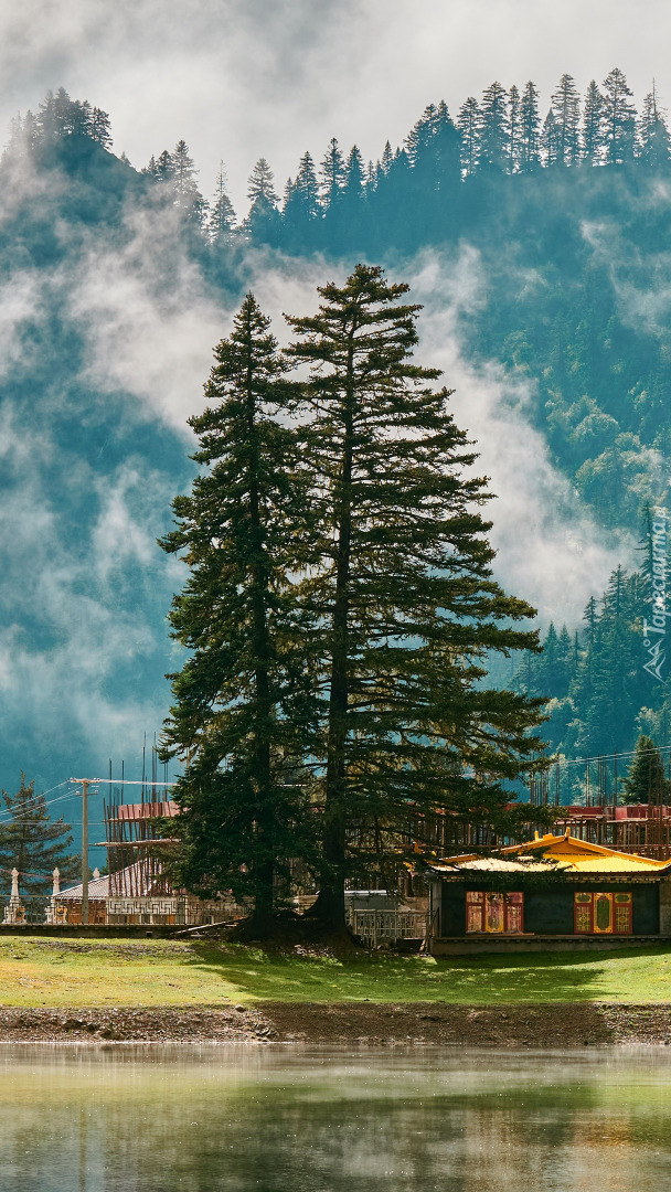 Edytor tapety: Drzewa i dom nad stawem