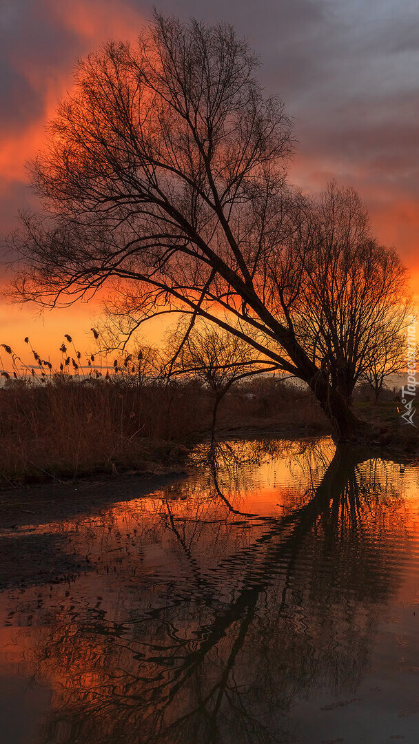 Edytor tapety: Odbicie pochyłego drzewa w rzece