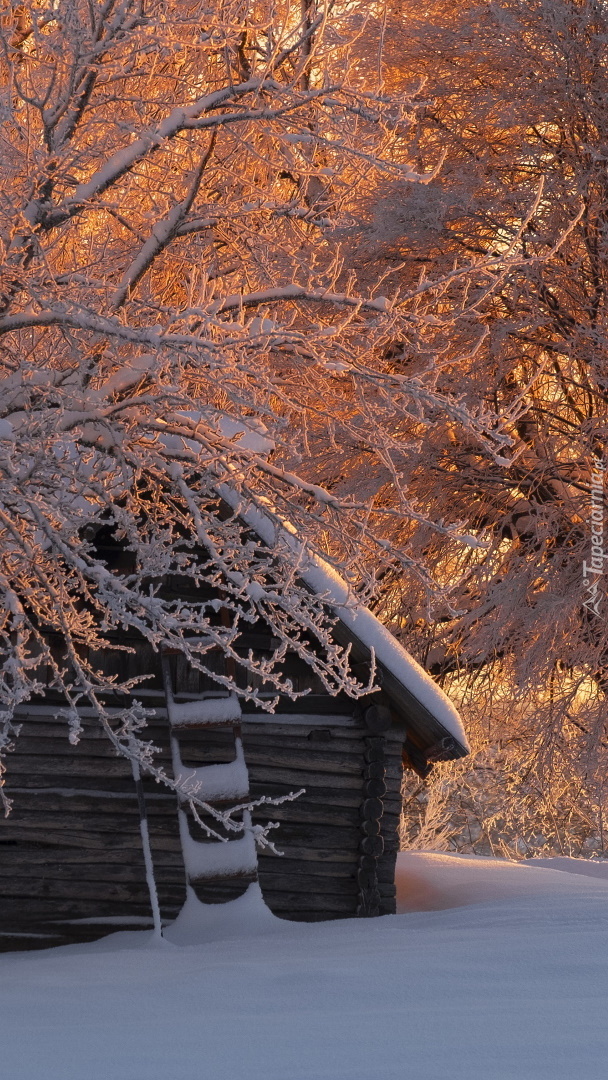 Edytor tapety: Ośnieżona drewniana szopa