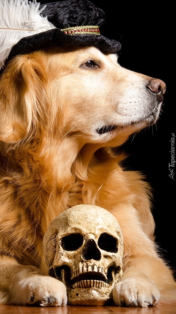 Edytor tapety: Golden retriever obok czaszki