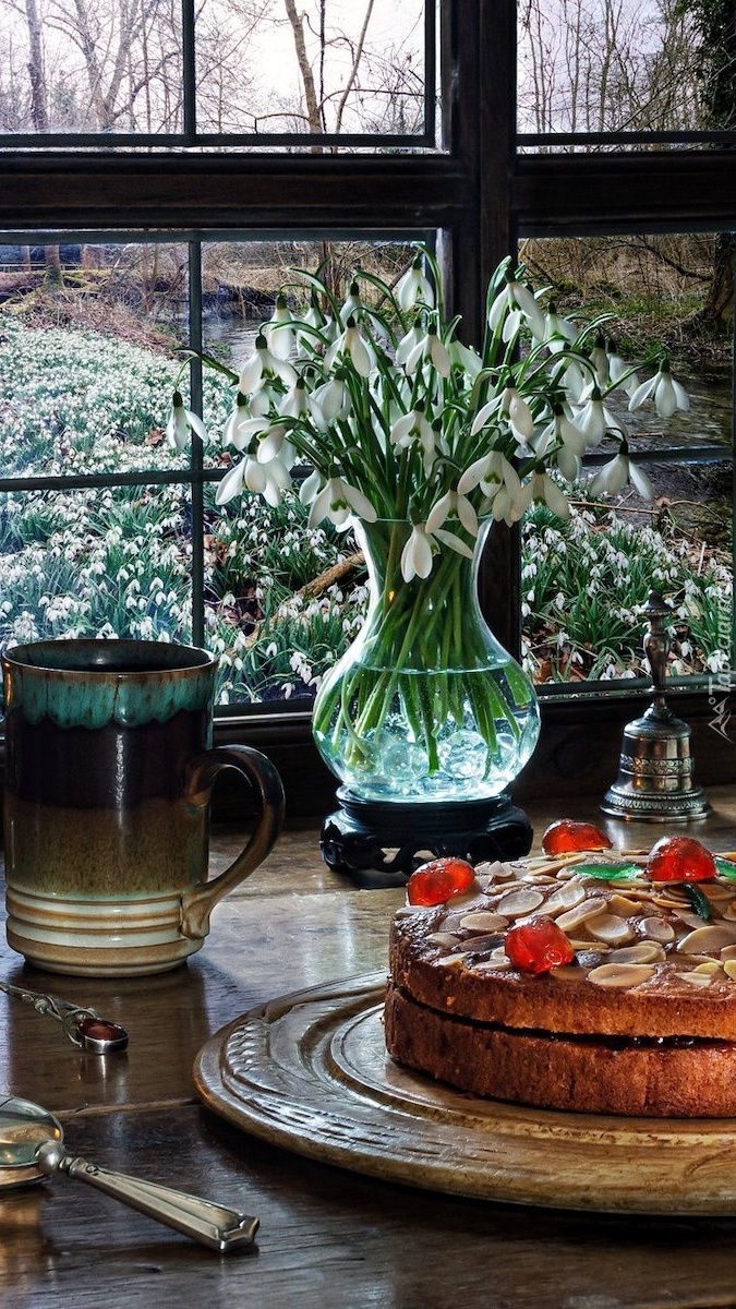 Edytor tapety: Bukiet przebiśniegów przy oknie