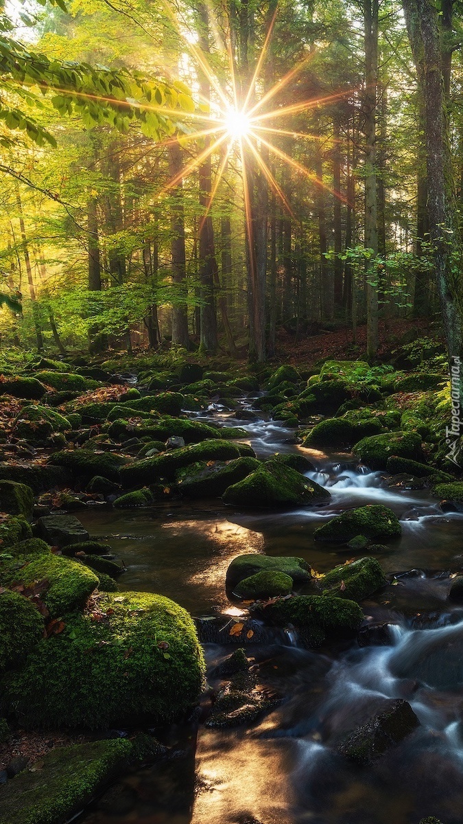 Edytor tapety: Słoneczny las z potokiem